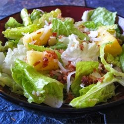 An easy salad to make with a bag of salad greens, pineapple, bacon bits, nuts and toasted coconut. Use fresh pineapple, if you can, and substitute toasted almonds for the macadamia nuts, if desired.