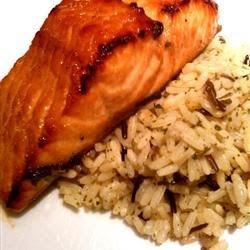An easy-to-make marinade enhances broiled salmon with the sweet-spicy flavors of brown sugar, soy sauce, olive oil, lemon juice, red pepper flakes, garlic and onion powders, and fresh cilantro.